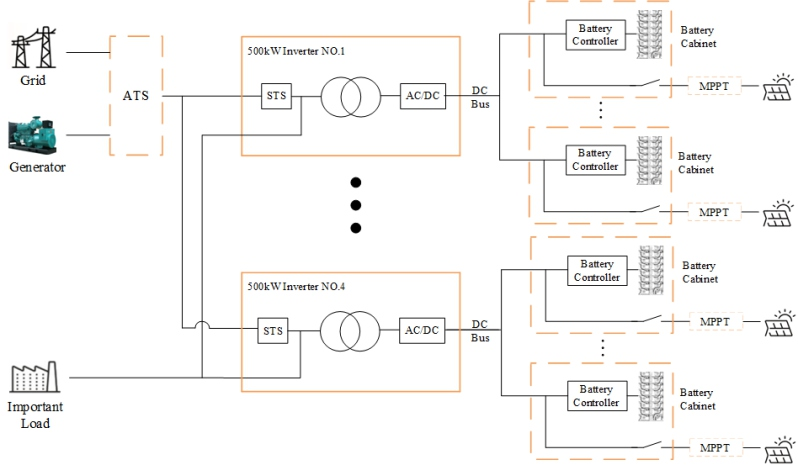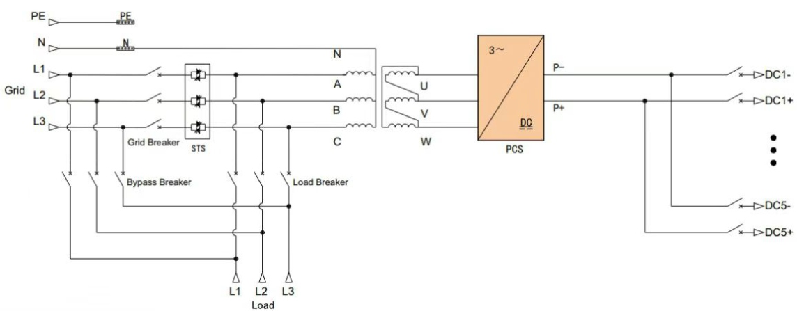 1. Yli 500 kW:n kuormituksissa suositellaan käytettäväksi suurikapasiteettista 500 kW:n yhden yksikön energiaa varastoivaa invertteriä, joka pystyy tukemaan jopa neljää rinnakkaiskytkentäsarjaa, jolloin kokonaisteho on 2 MW;